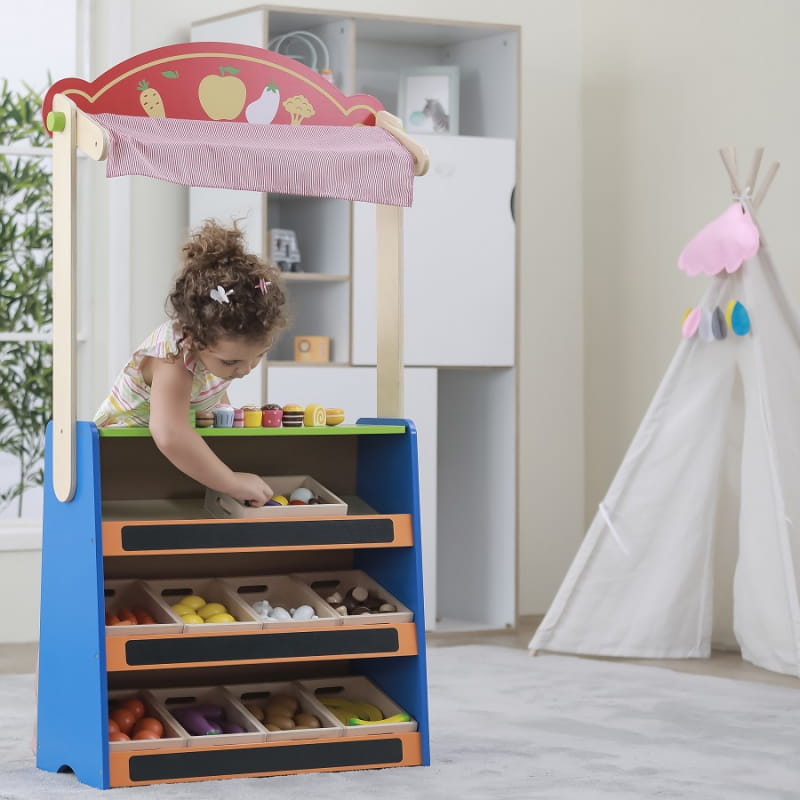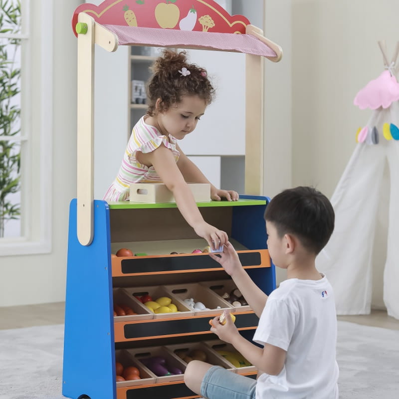 Ta wysokiej jakości zabawka to połączenie teatru i sklepu spożywczego. Wystarczy odwrócić zabawkę i możemy już wcielać się w zupełnie nowe role.