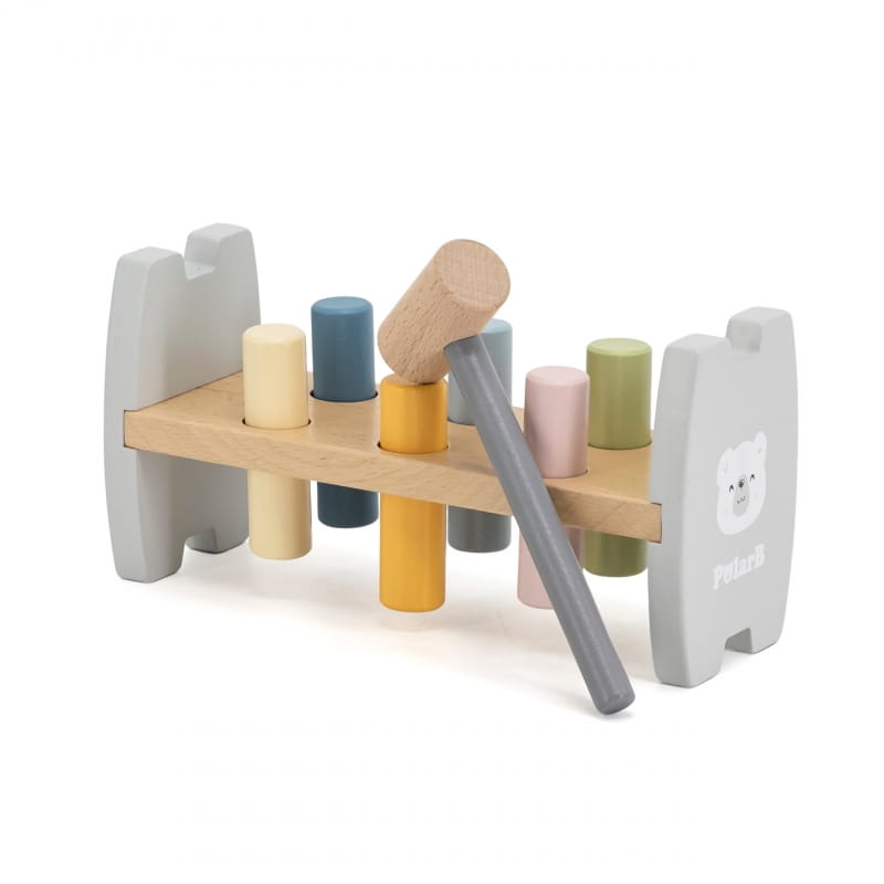 - drewniana przebijanka – kolorowa ławeczka z 6 kołkami i młoteczkiem, która rozwija elastyczność nadgarstka i koordynację ruchową