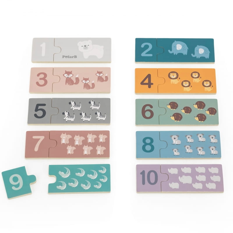 - puzzle z numerami – zestaw do nauki liczenia od 1 do 10 oraz rozwijania umiejętności sekwencjonowania liczb i rozpoznawania ilości