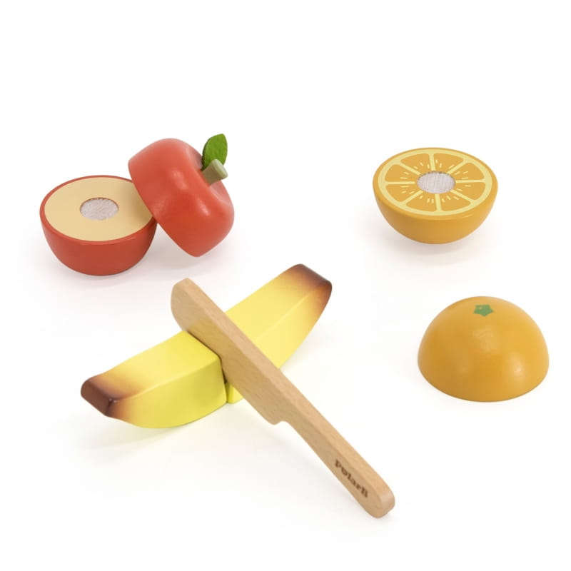 - zestaw do krojenia owoców – drewniane owoce do krojenia, idealne do nauki koordynacji ręka-oko oraz rozwijania umiejętności społecznych przez zabawę w role