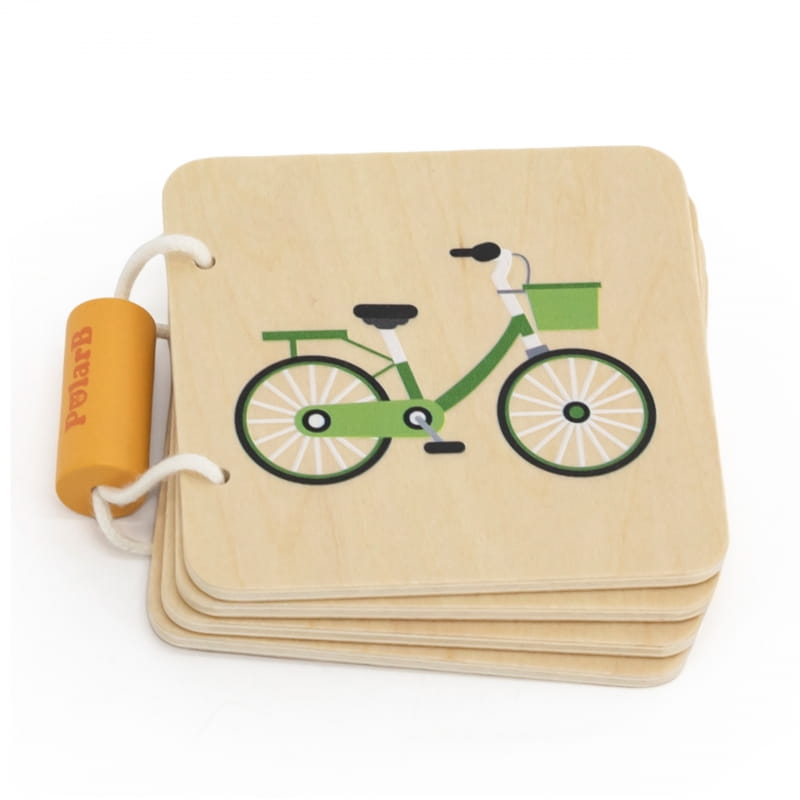 - książeczka drewniana (pojazdy) – książeczka uczy dzieci o różnych środkach transportu, takich jak rower, balon, samolot czy autobus szkolny