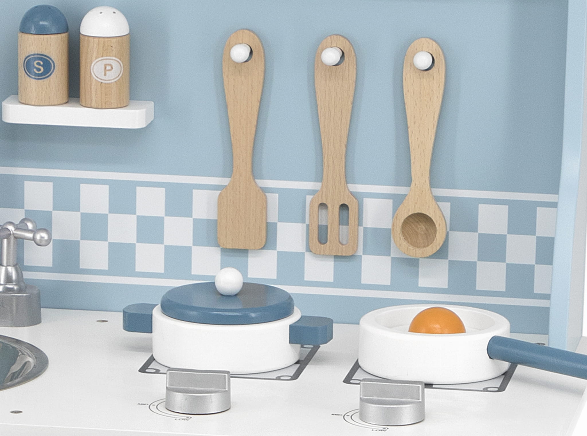 Naczynia możesz umyć w zlewie i ponownie gotować do woli. Kuchenka wspaniale wzbogaci posiadane naczynia i zestawy do krojenia – które w dowolny sposób można ze sobą łączyć. Z pewnością mama pożyczy małemu kucharzowi kilka foremek do babeczek i nie tylko.
