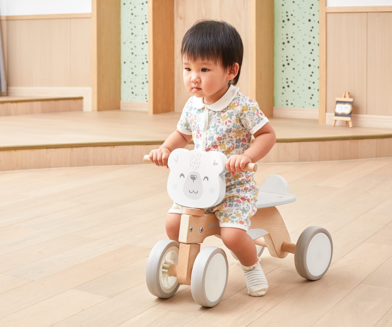 Ten uroczy, drewniany jeździk w kształcie misia zapewnia maluchom bezpieczną zabawę dzięki solidnej konstrukcji z drewna oraz czterem wytrzymałym oponom EVA, które zapewniają płynność podczas jazdy.