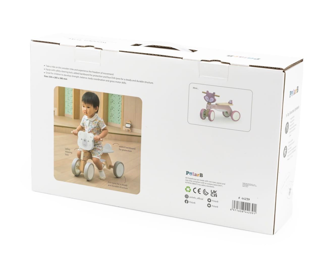 Wybór jeździka od marki Viga 44239 PolarB Drewniany jeździk - Miś to doskonała decyzja, zwłaszcza jeśli chcesz, aby Twoje Dziecko rozwijało swoje umiejętności motoryczne w bezpieczny i zabawny sposób. Doskonała propozycja dla dzieci, które dopiero zaczynają swoją przygodę z samodzielnym poruszaniem się na pojazdach. Wymienić należy główne cechy produktu: blokada skrętu kierownicy, zwiększa bezpieczeństwo malucha, ograniczając możliwość zbyt gwałtownego skręcania; dodatkowa tylna deska zapewnia dodatkową ochronę podczas jazdy; cztery opony z materiału gwarantują trwałość i stabilność nawet na różnych powierzchniach.