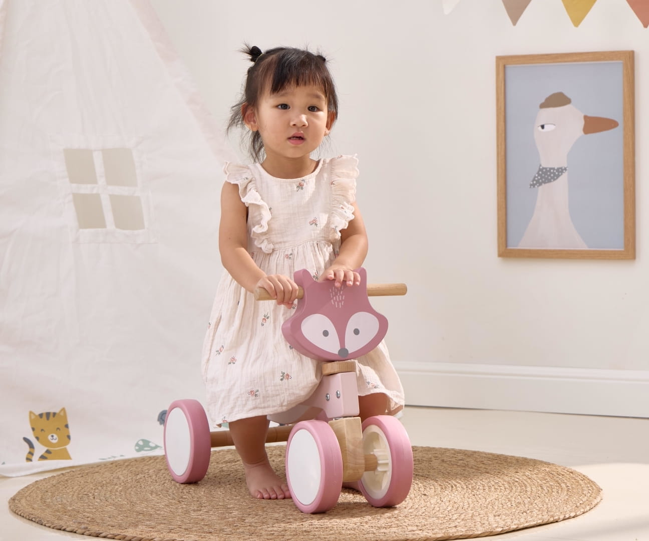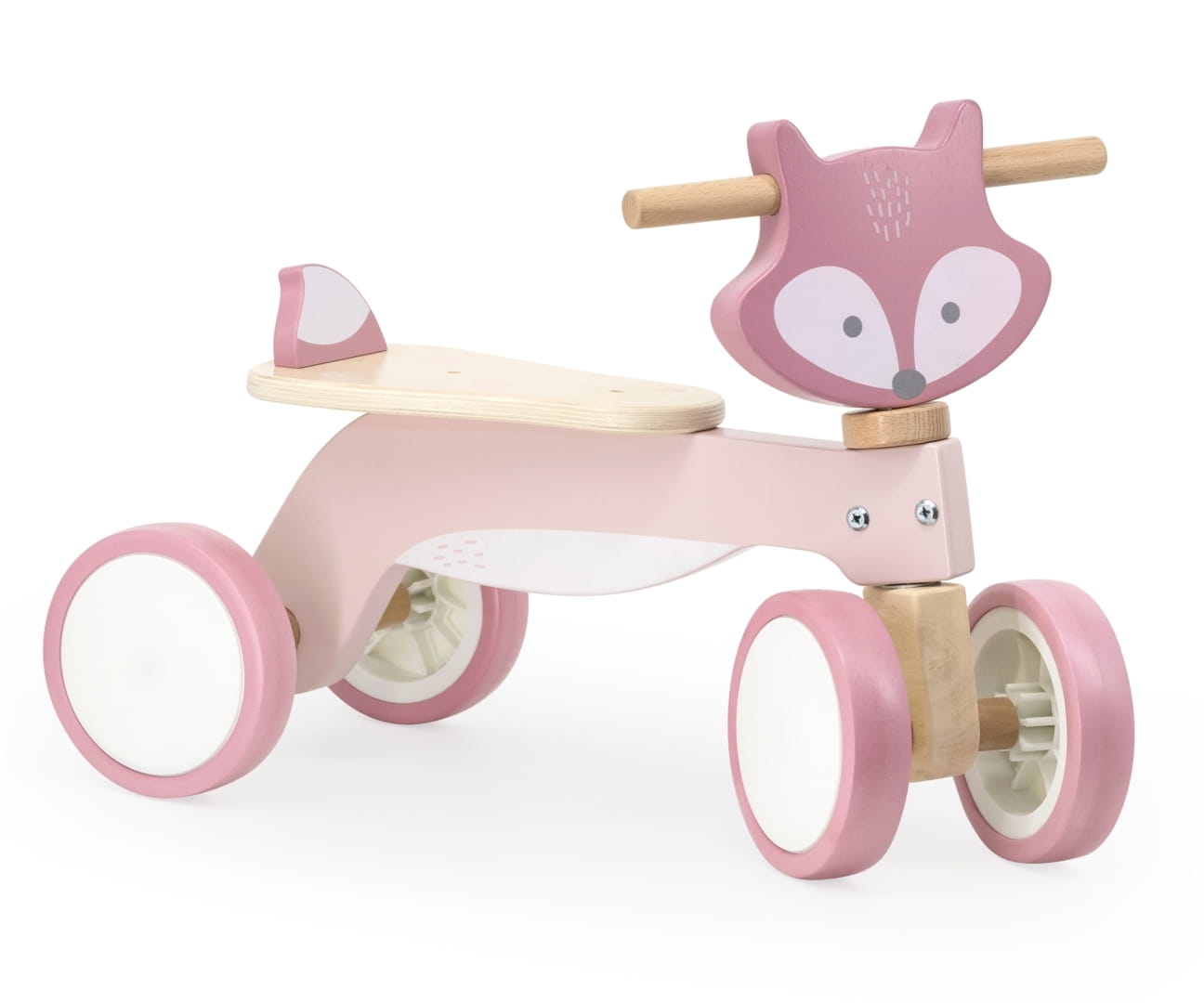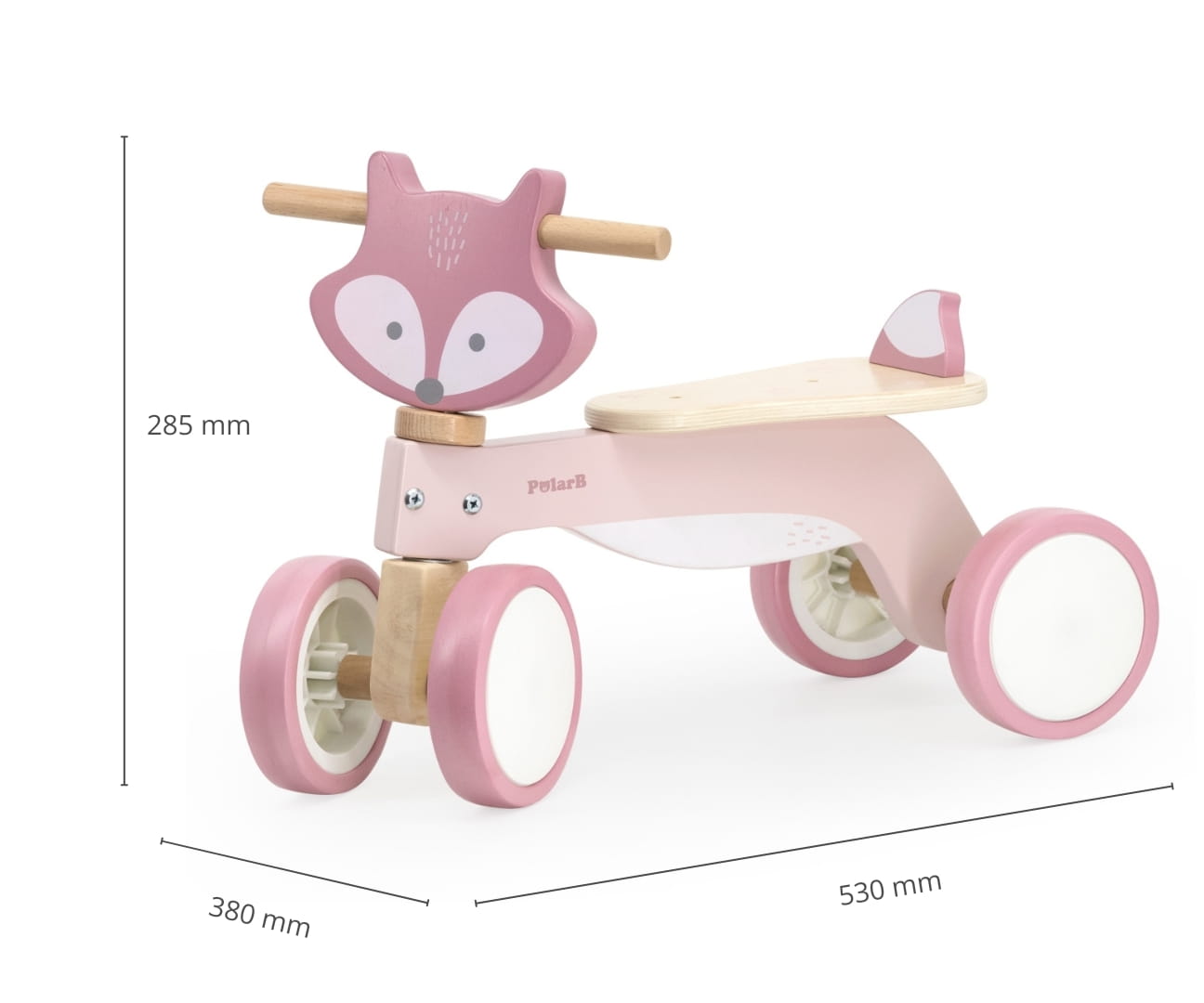 Ten uroczy, drewniany jeździk w kształcie liska zapewnia maluchom bezpieczną zabawę dzięki solidnej konstrukcji z drewna oraz czterem wytrzymałym oponom EVA, które zapewniają płynność podczas jazdy.