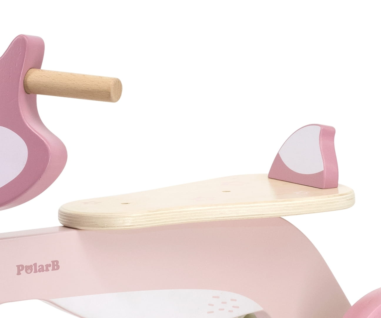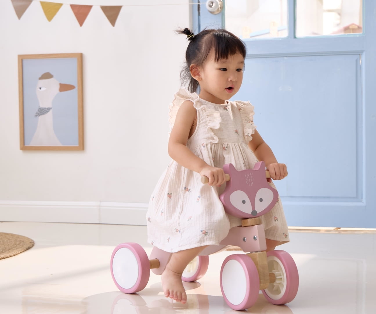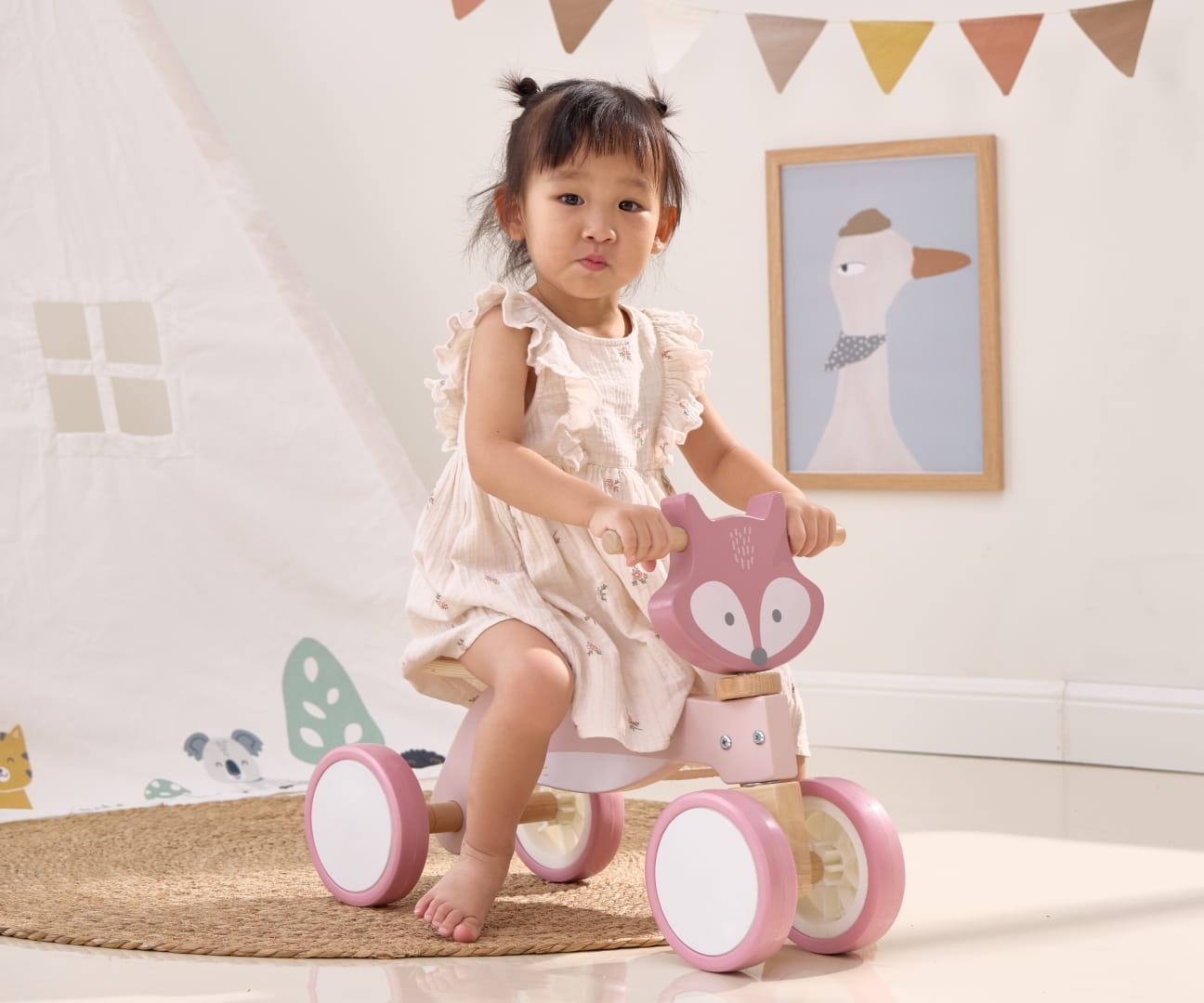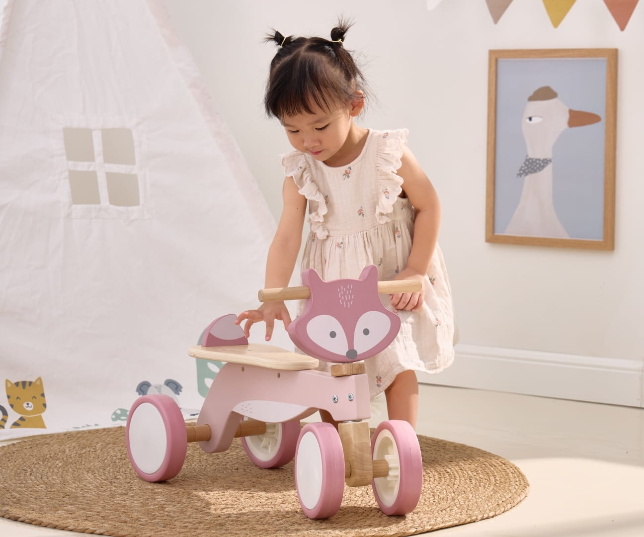 Ten uroczy, drewniany jeździk w kształcie liska zapewnia maluchom bezpieczną zabawę dzięki solidnej konstrukcji z drewna oraz czterem wytrzymałym oponom EVA, które zapewniają płynność podczas jazdy.