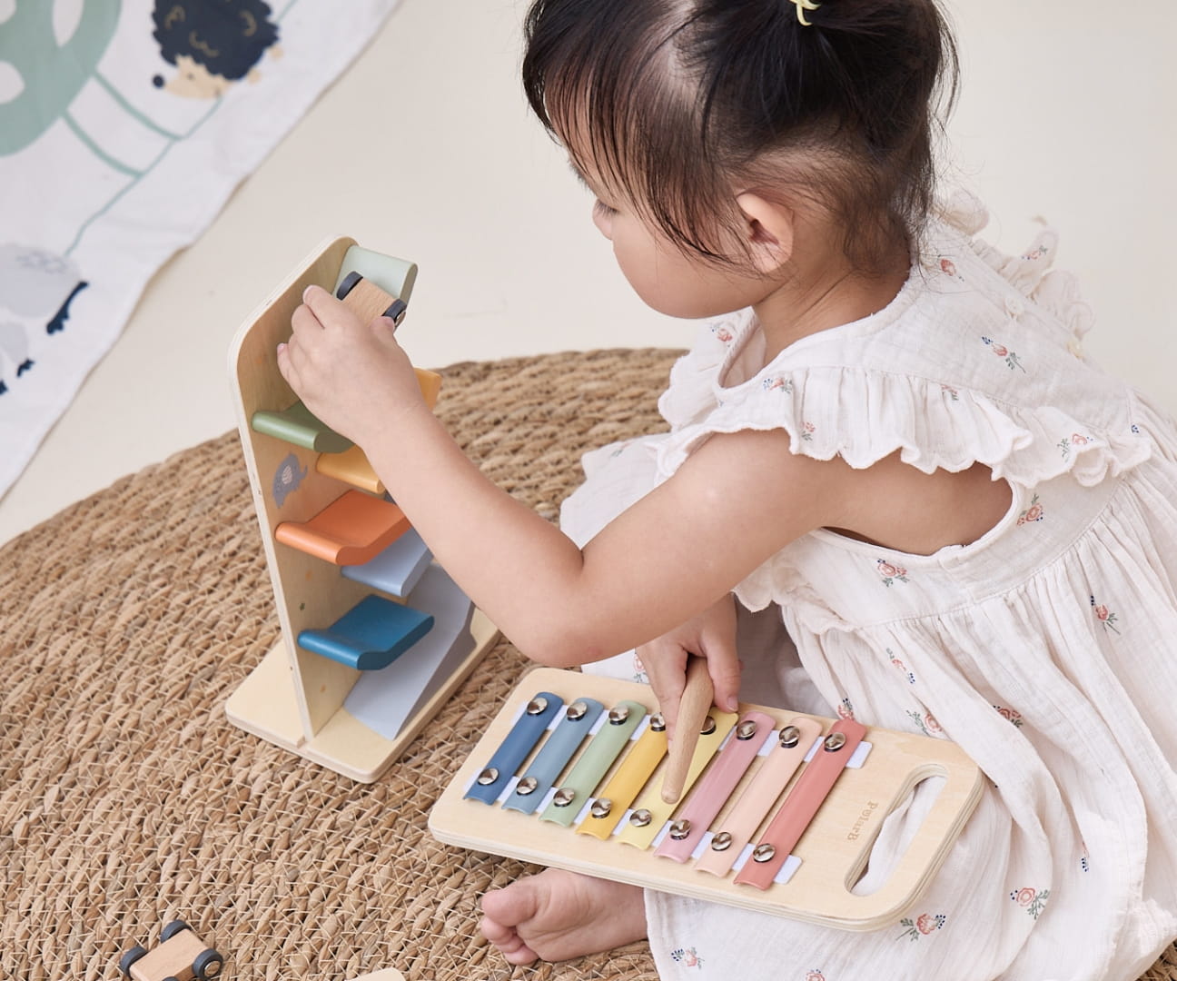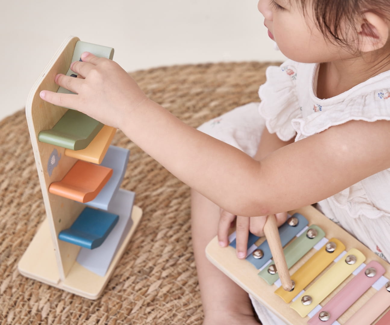 Użyj drewniane klocki/ ułamki i podstawę do dopasowywania kształtów, aby uczyć dziecko rozpoznawania kształtów i kolorów i dzielenia ich na ułamki oraz użyj elementów do zakręcania i odkręcania aby rozwijać koordynację ręka-oko. Zagraj na cymbałkach, które wprowadzi dziecko w świat dźwięków i melodii, pomagając w rozwijaniu zmysłu słuchu oraz poczucia rytmu. Ustaw tor z 2 kolorowymi samochodzikami na zjeżdżalni, aby dziecko mogło obserwować, jak samochodziki zjeżdżają po różnych torach, co wzmacnia jego zdolności motoryczne i cierpliwość. Wykorzystaj dołączoną drewnianą książeczkę z namalowanymi owocami do dotykania, poznawania i nazywanie nazw poszczególnych owoców by rozwijać u dziecka zdolności poznawcze. Użyj sznurka i klocków do nawlekania, co pomoże rozwijać precyzję ruchów i zdolności manipulacyjne.
