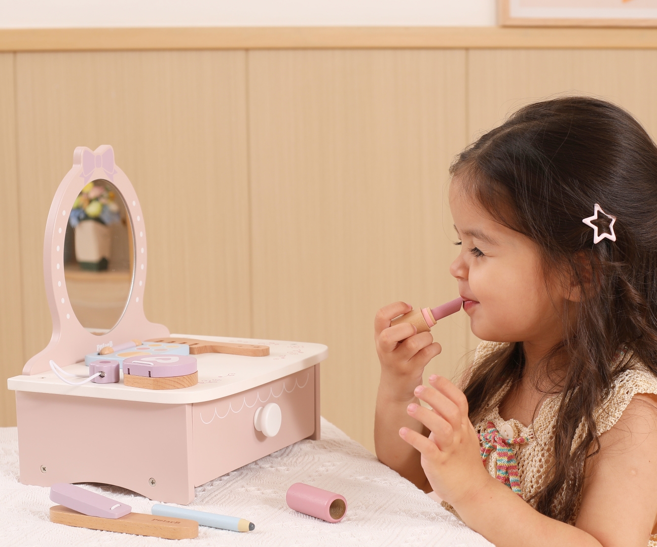 Delikatne kolory i dbałość o detale uczą dziecko poczucia estetyki i porządku. Toaletka może stać się piękną dekoracją dziecięcego pokoju, zachęcając do utrzymania porządku.