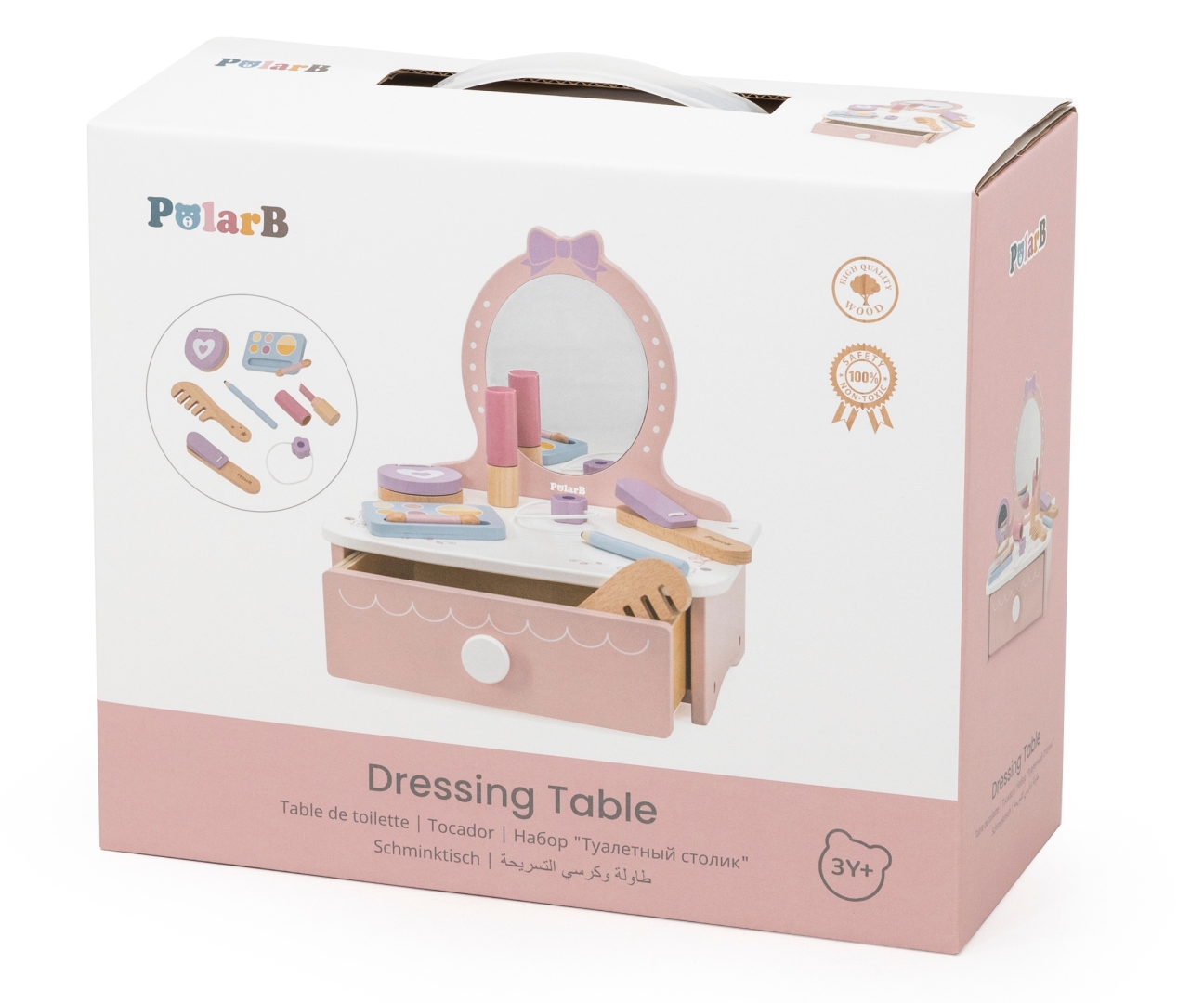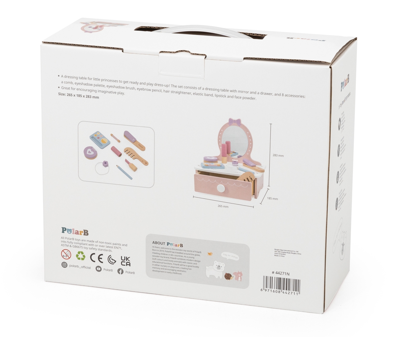 Szukasz stylowego, bezpiecznego i edukacyjnego prezentu dla dziewczynki powyżej 3. roku życia? Viga 44271N PolarB Drewniana toaletka z akcesoriami do zabawy jest pakowana w estetyczne pudełko, gotowe do wręczenia!
