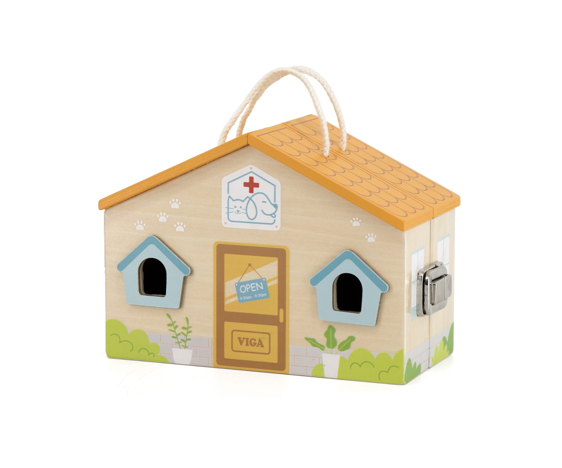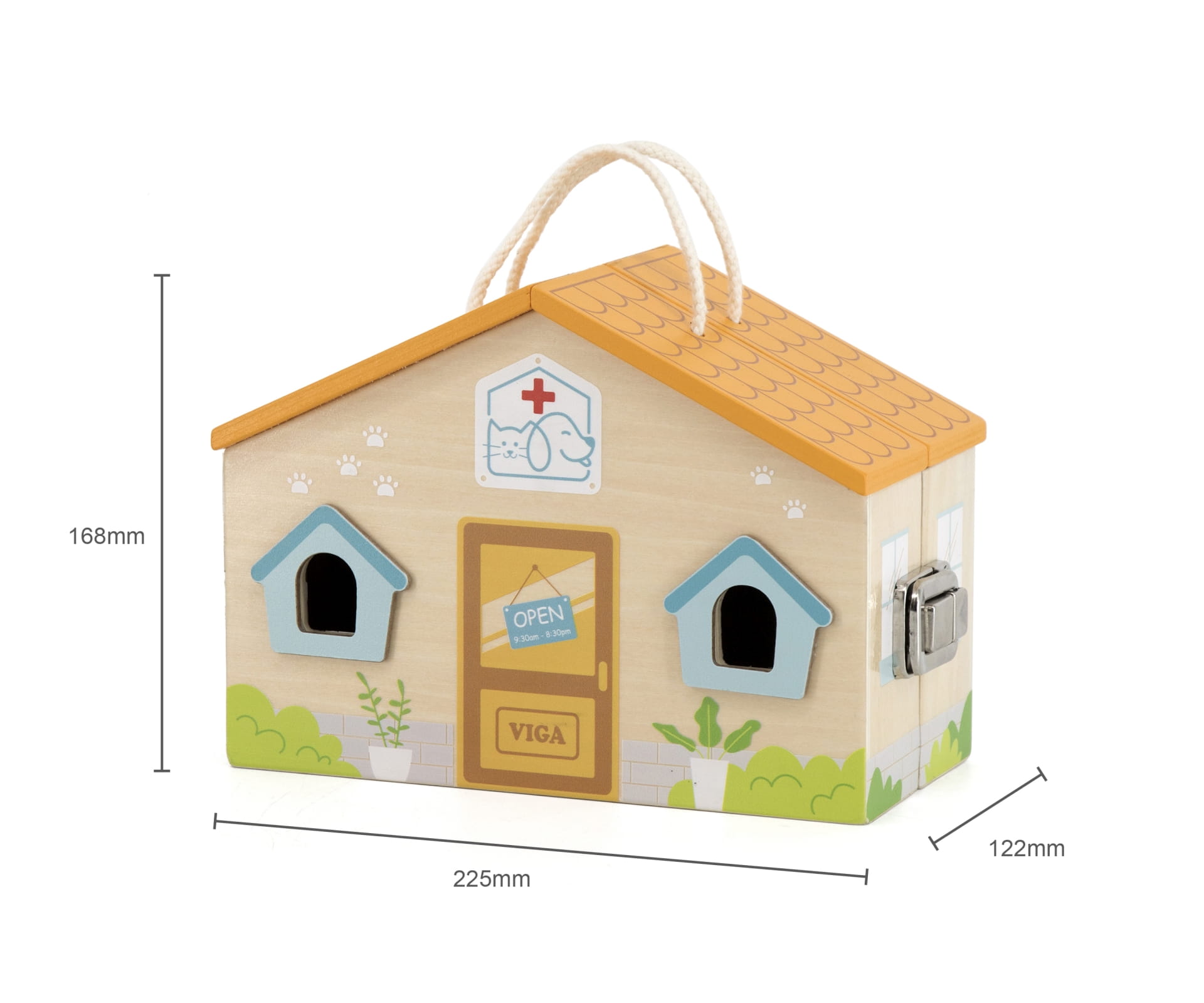 Całość zamknięta w domku – gabinecie weterynarza który pomieści wszystkie załączone elementy. Wnętrze gabinetu posiada jasne ściany na których znajdują się plansze z wizerunkami zwierzątek zegar oraz niezbędne wyposażenie gabinetu – jak w prawdziwym gabinecie. Forma walizeczki z rączkami ułatwia transport oraz przechowywanie – zabawkę można zabrać ze sobą wszędzie.