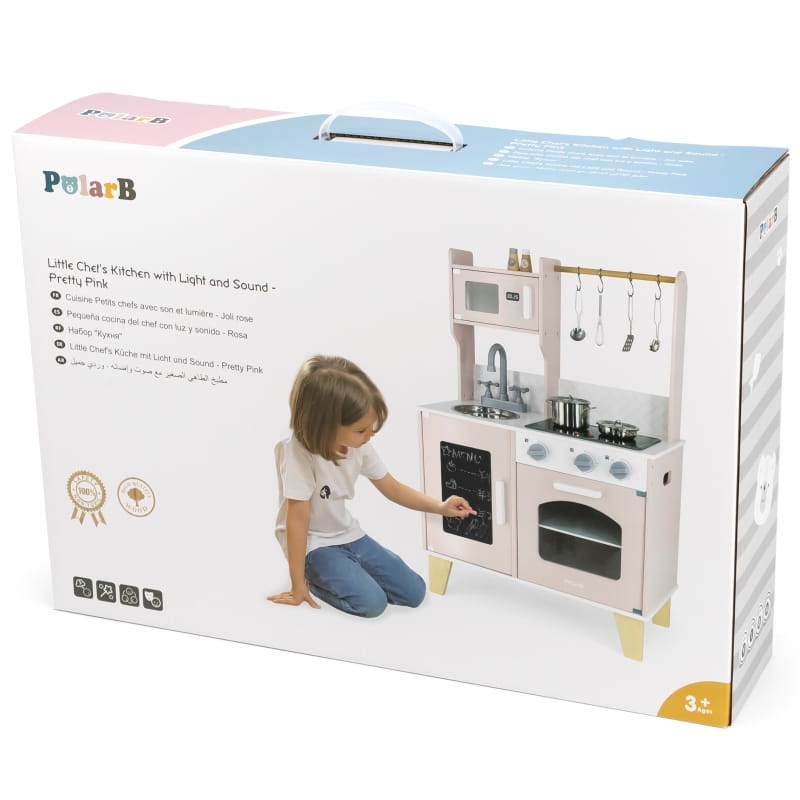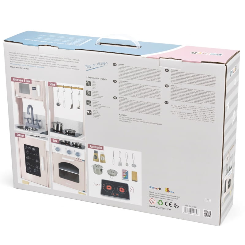 Ta kuchnia drewniana dla dzieci została wykonana z wysokiej jakości drewna, co gwarantuje trwałość i odporność na intensywną zabawę. Naturalne materiały są nie tylko przyjazne dla środowiska, ale także w pełni bezpieczne dla dzieci. Zabawka jest pomalowana nietoksycznymi farbami, a gładkie krawędzie eliminują ryzyko skaleczeń. Dzięki eleganckiemu designowi i stonowanym kolorom, kuchnia pięknie komponuje się z każdym wnętrzem – od pokoju dziecięcego po salon.