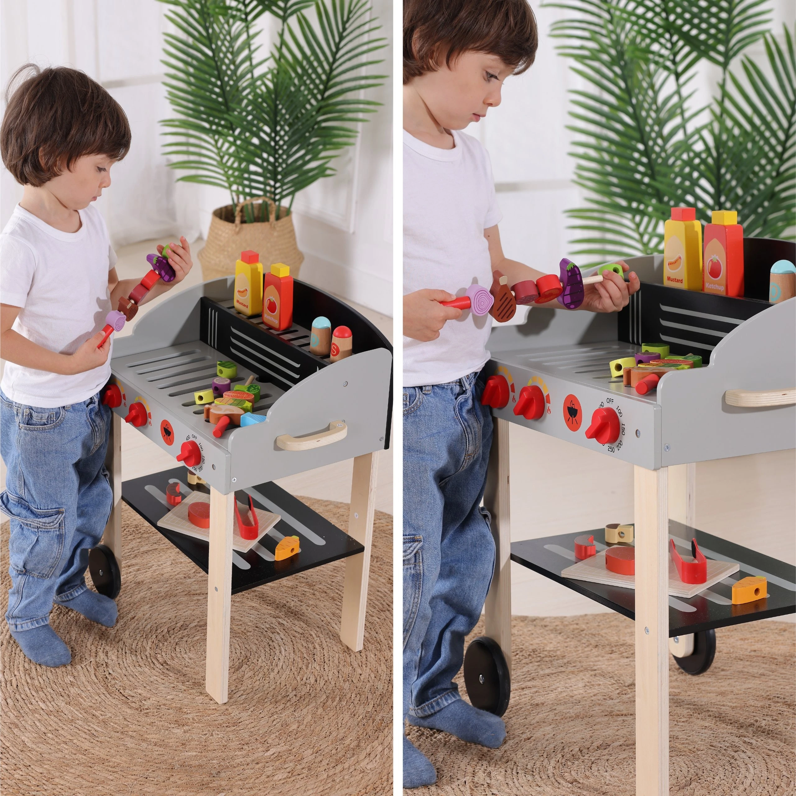 Grill został wyposażony w stabilne kółka, co pozwala dziecku na swobodne przemieszczanie swojego stanowiska pracy. Czy dziś grillujemy na tarasie, czy w salonie? Z WOOPIE GREEN Grill Drewniany Szaszłyki Warzywa Akcesoria 24el. każda lokalizacja jest dobra na mały bankiet! Dodatkowa dolna półka pomaga utrzymać porządek w akcesoriach po skończonej zabawie.