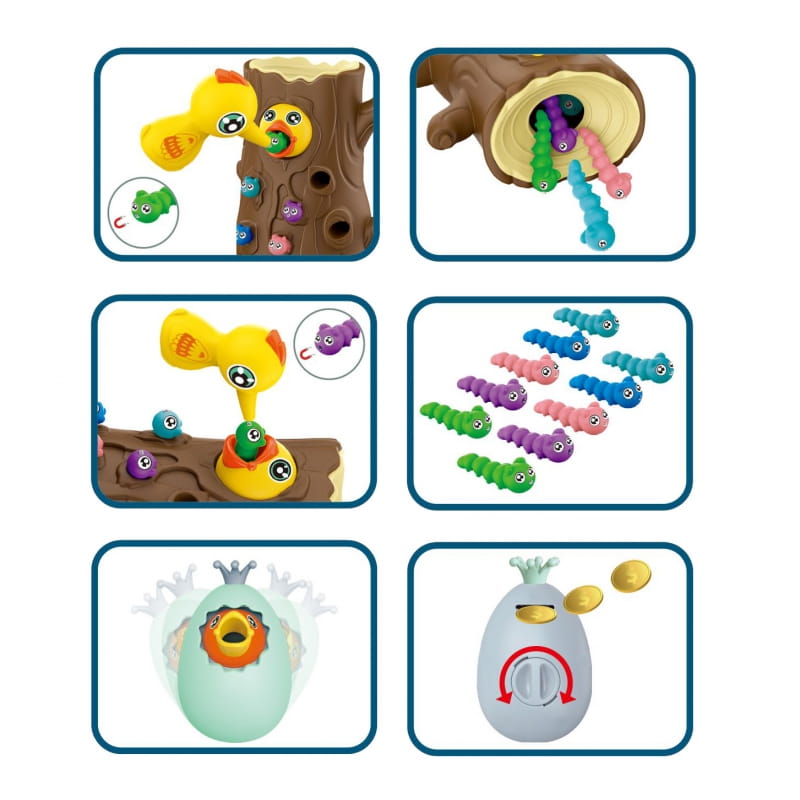 Gra Zręcznościowa Złap Robaczka od marki WOOPIE to doskonały sposób na wspólne spędzanie czasu z dzieckiem. Proste zasady oraz intuicyjna obsługa sprawiają, że zagrać w nią może praktycznie każdy. Zabawa polega na chwytaniu dzięciołem zakończonym magnesem robaczków ukrytych w otworkach znajdujących się w drzewie, a następnie na ich ponownym wkładaniu w dziób ptaszka. W zestawie oprócz mamy i taty dzięcioła do karmienia pisklaka, kłody z pisklakiem i 10 robaków, znajduję się jajko pisklak, który służyć może dodatkowo jako wańka wstańka do kołysania oraz skarbonka. Zestawem może się bawić jednocześnie dwoje dzieci. Gra uczy przez zabawę - pomoże rozwinąć m. in. umiejętności motoryczne (ruchowe) oraz wzrokowe. Zabawka jest sporym wyzwaniem dla malucha, wymaga skupienia uwagi oraz sprawności manualnej, ale przez to niezwykle zaciekawi dziecko.