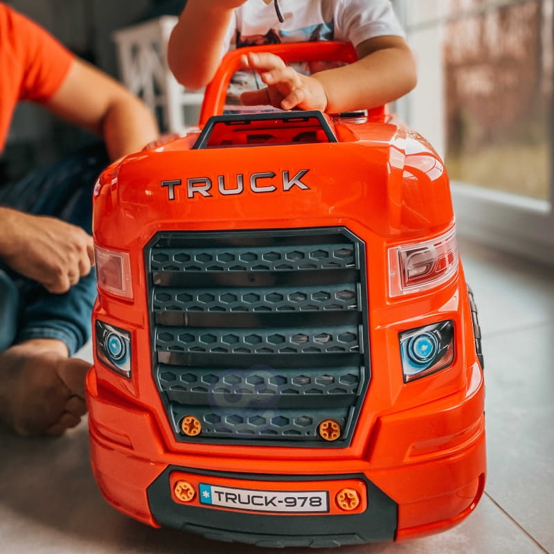 Zabawka imitująca przód ciężarówki marki WOOPIE z podnoszoną maską, kierownicą oraz deską rozdzielczą z drugiej. Po otworzeniu schowku pod kierownicą dziecko znajdzie w środku mnóstwo atrakcji w postaci narzędzi, pokręteł i śrub. Młody mechanik może dokonywać wielu napraw i przeglądów swojego pojazdu (np. kół, błotników, silnika, świec zapłonowych, grilla chłodnicy). Zabawka wyposażona jest w moduł dźwiękowy (odgłosy silnika i klakson) i świetlny (świecą reflektory). Dodatkowo w zestawie jest pilot umożliwiający sterowanie modułami. W celu zdjęcia kół można zastosować umieszczony w zabawce podnośnik. Z całą pewnością jest to zestaw jedyny w swoim rodzaju, oferujący niezliczoną ilość możliwości zabawy.