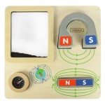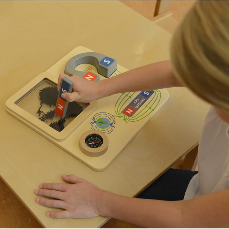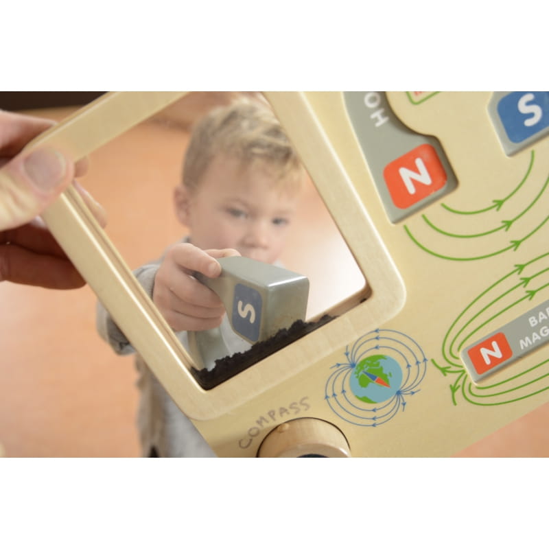 Drewniana tabliczka edukacyjna, dzięki której dziecko będzie mogło na własne oczy zobaczyć jak działa magnes. Zabawka zawiera duży magnes w kształcie podkowy, z oznaczonymi biegunami, a także magnes w kształcie bloczka. Na tabliczce znajduje się również pojemniczek z opiłkami żelaza. Przyciągając je, dziecko może obserwować linie magnetyczne. Zabawka posiada również kompas.