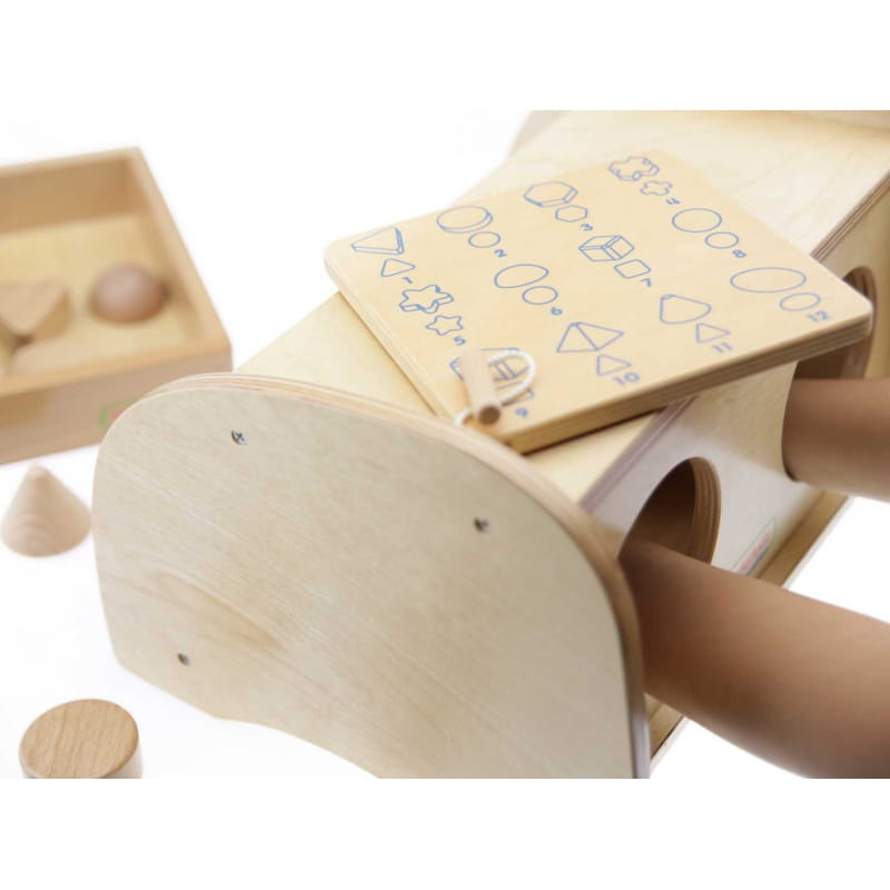 W zestawie drewniana tacka do przechowywania zabawek.