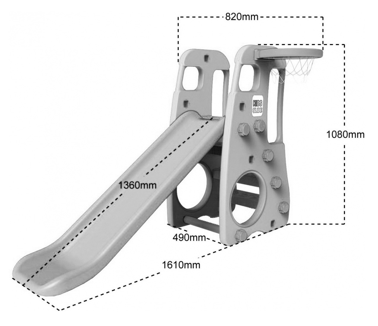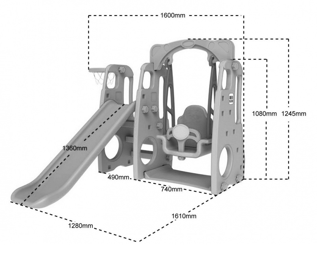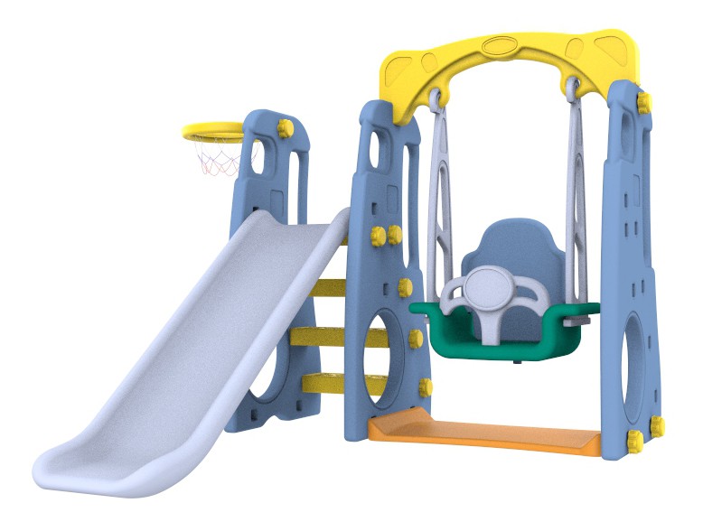 - W zestawie: Obręcz do kosza, piłka do gry, stabilna huśtawka, zjeżdżalnia.